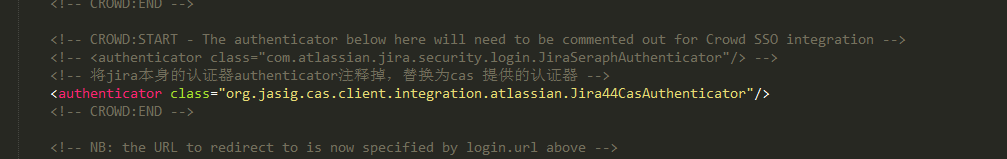 <!-- 将jira本身的认证器authenticator注释掉,替换为cas 提供的认证器 -->