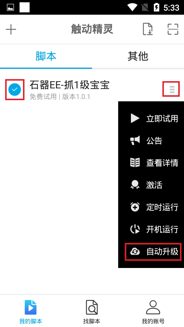- 下载完成后,勾选脚本选择操作按钮,选中自动更新。