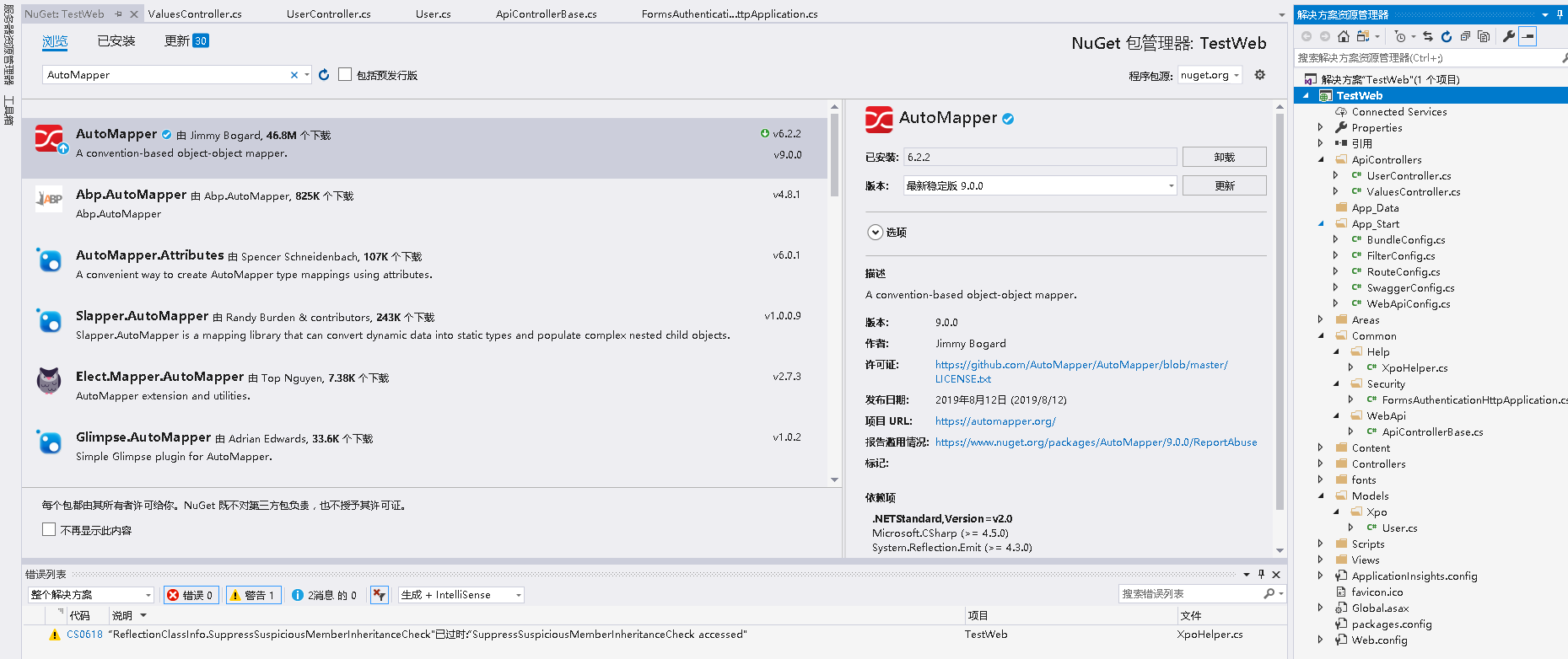 安装成功后,编写一个类(需继承AutoMapper中的基类 Profile)来存放实体类和视图类的映射关系