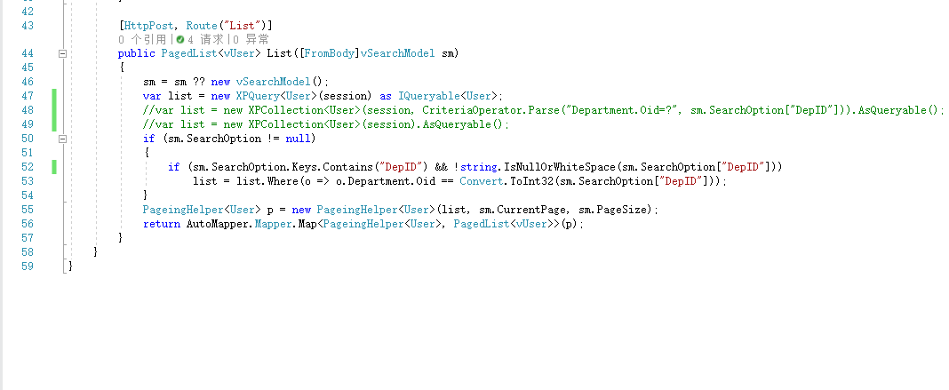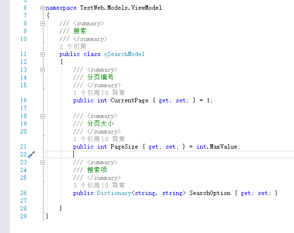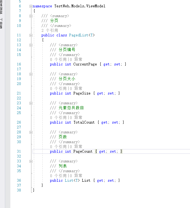 namespace TestWeb.Common.Engine{/// <summary>/// 分页/// </summary>/// <typeparam name="T"></typeparam>public class PageingHelper<T>{/// <summary>/// 分页编号/// </summary>public int CurrentPage { get; set; }/// <summary>/// 分页大小/// </summary>public int PageSize { get; private set; }private int? _totalCount;/// <summary>/// 元素总共数目/// </summary>public int TotalCount{get{if (_totalCount == null) _totalCount = Query.Count();return (int)_totalCount;}}/// <summary>/// 页数/// </summary>public int PageCount{get{return TotalCount == 0 ? 0 : (int)Math.Ceiling((decimal)TotalCount / PageSize);}}private IQueryable<T> Query { get; set; }public List<T> List { get; private set; }/// <summary>/// 构造函数/// </summary>/// <param name="list">链表</param>/// <param name="intPageIndex">编号</param>/// <param name="intPageSize">大小</param>public PageingHelper(IQueryable<T> list, int intPageIndex, int intPageSize){CurrentPage = intPageIndex;PageSize = intPageSize;Query = list;GetPagedList();}/// <summary>/// 转为为分页/// </summary>/// <param name="list">链表</param>public void GetPagedList(){if (CurrentPage > PageCount) CurrentPage = PageCount;if (CurrentPage < 1) CurrentPage = 1;int intStart = (CurrentPage - 1) * PageSize;List = Query.Skip(intStart).Take(PageSize).ToList();}}}