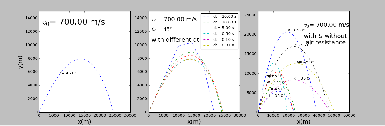 取V0=700,角度45度,dt分别取20,10,5,0.5,0.1,0.01。