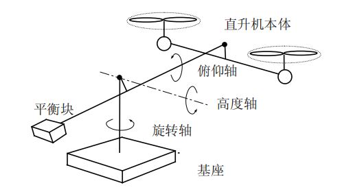 三自由直升机系统由基座、平衡块和螺旋桨等部分组成,平衡杆以基座为支点,做俯仰和转动动作。螺旋桨和平衡块分别安装在平衡杆的两端。螺旋桨旋转产生的升力可以使平衡杆以基座为支点做俯仰运动,利用两个螺旋桨的速度差可以使平衡杆以基座为轴做旋转运动。平衡杆的旋转轴、俯仰轴和螺旋桨的横侧轴都都分别安装了编码器,用来测量平衡杆俯仰轴、旋转轴和螺旋桨横侧轴的数据。两个螺旋桨分别由两个直流无刷电机驱动,为螺旋桨提供动力。通过调节安装在平衡杆另一侧的平衡块可以减少螺旋桨电机的出力。安装在基座的集电环保证了系统本体和电控箱之间的信号传输不受直升机转动的影响。