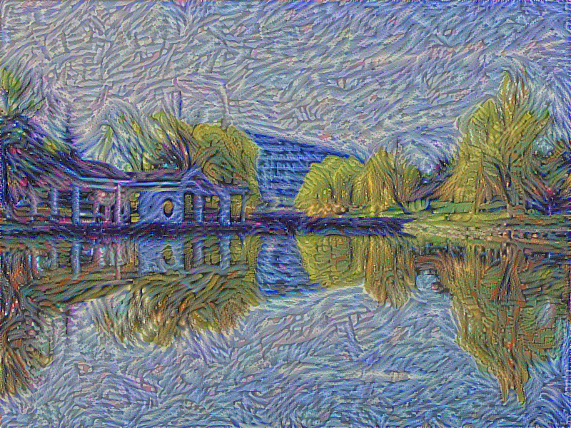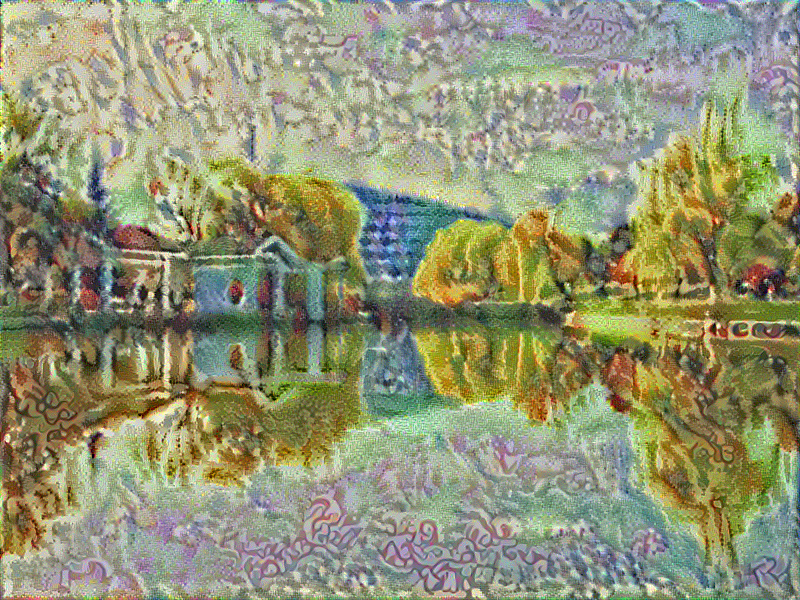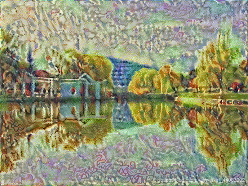 ![此处输入图片的描述300次 ][12是一个对莫奈的一张风景画的风格进行学习,并将其迁移到一张西工大的风景图片上的实现。