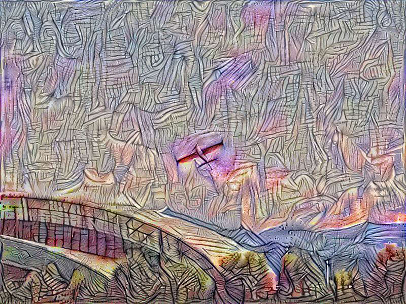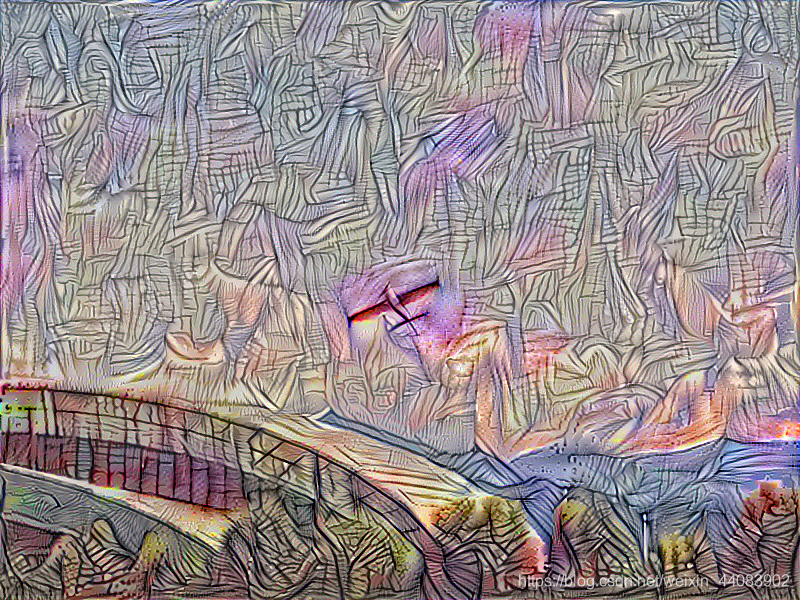 (毕加索这一幅抽象画,主要风格表现在线条上:以整体的细致纹理来表现面积为主。迭代训练300次以后的图片,其效果并不佳,尝试加大训练次数以后,其线性特征在局部不断强化,表现为原有线条的加深和图片明度、对比度的提高,但是呈现出来的整体风格也比较勉强,没有出现大面积较长而规律排布的细线条特征。)