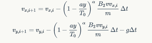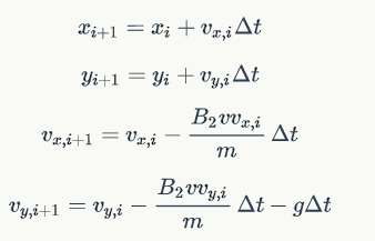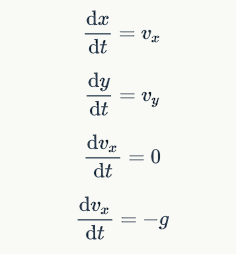 vx and vy are the speed of the horizontal and vertical components of vector. Using the Euler method, each equation written for small changes in the limited form, to calculate the position and speed's change of every dt.Given the initial position and velocity, then calculate the later movement. When the dt is small enough, calculated by Euler numerical results close to the real (analytical) solutions.