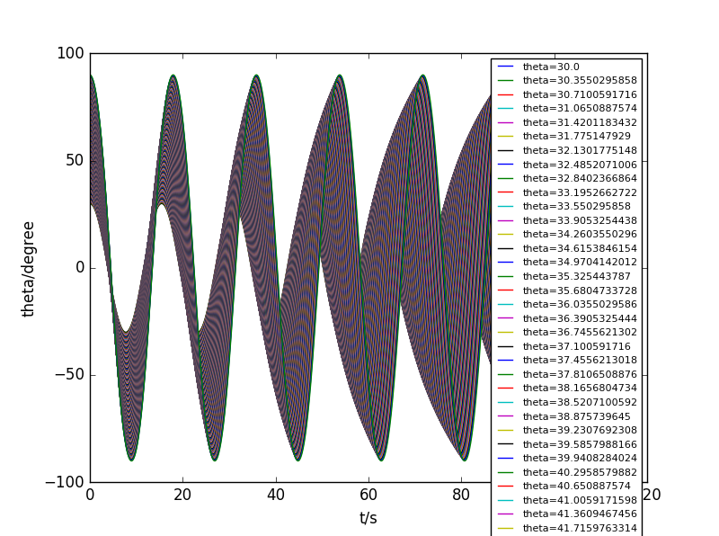 This homework is to solve 3.8 problem of textbook exercises. In the absence of small angle approximation,study the law of real pendulum,assuming that the swing arm is a massless rigid rod, which will allow us to consider the swing of more than angle 90. Do not take the small angle approximation.In a certain length of pendulum and the acceleration of gravity, the cycle will be associated with the pendulum swing, and the swing is bigger, the cycle will be longer. This assignment will be numerical trajectories of different swing hem, and make the swing cycle diagram.