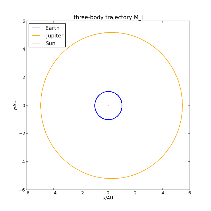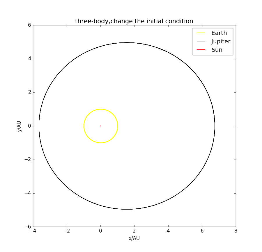 It can be found that the center of mass system, keep the total momentum is 0, larger in terms of initial velocity of circular Jupiter, the earth around the sun, but the position of the sun off center.