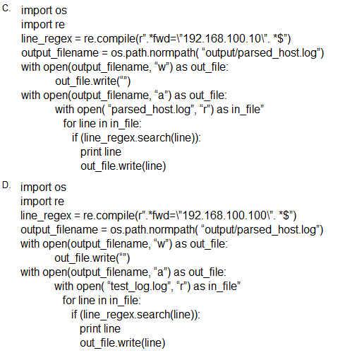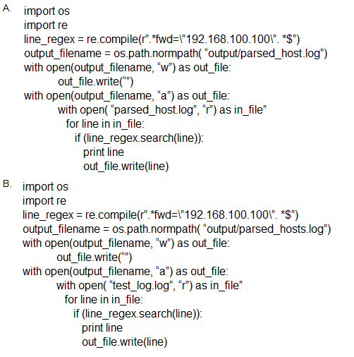 Which scripts will search a log file for the IP address of 192.168.100.100 and create an output file named parsed_host.log while printing results to the console?