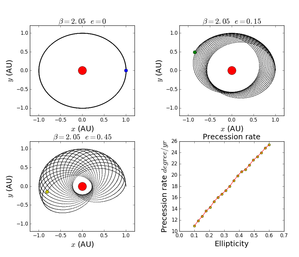 We can see that only when can the orbit maintain a closed curve. If the initial eccentricity is not zero, the precession will happen.(see picture b and c) The last picture shows the relationship between the precession speed(expressed by the angular velocity of the perihelion). The larger the eccentricity is, the faster the precession will be.