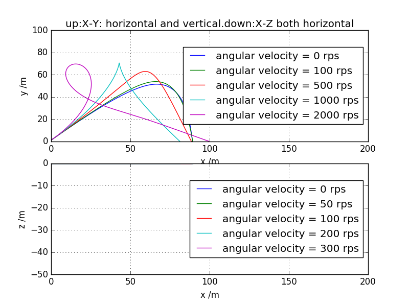 For simplicity, we consider a ball with normal texture, speed of wind is set to zero, the hitting angleis , and the initial speed is still .and the spin axe is set verticle to the ground, that is to say is verticle