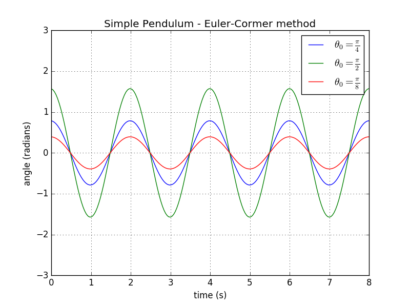 Then we use the Euler-Cromer method to do the numerical simulation, draw the function of angle respect to time . The release angles is set to , and respectively, lengths of the string are all set to 1.