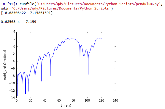 c=chaotic_pendulums()c.cal_d_theta()c.show_result2()z=np.polyfit(a.t,a.d_theta,1)p=np.poly1d(z)print(z)print(p)