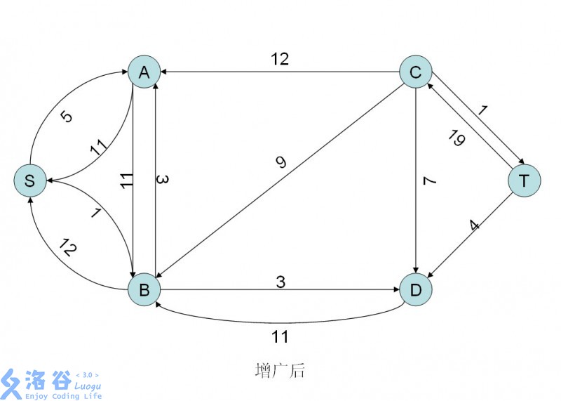 残量网络中的从源点到汇点的有向路径称为增广路,对于增广路,将其中的每个弧都增大最小残量的流量,那么,流量会增大并且不会违法。图中红边即为一条增广路。