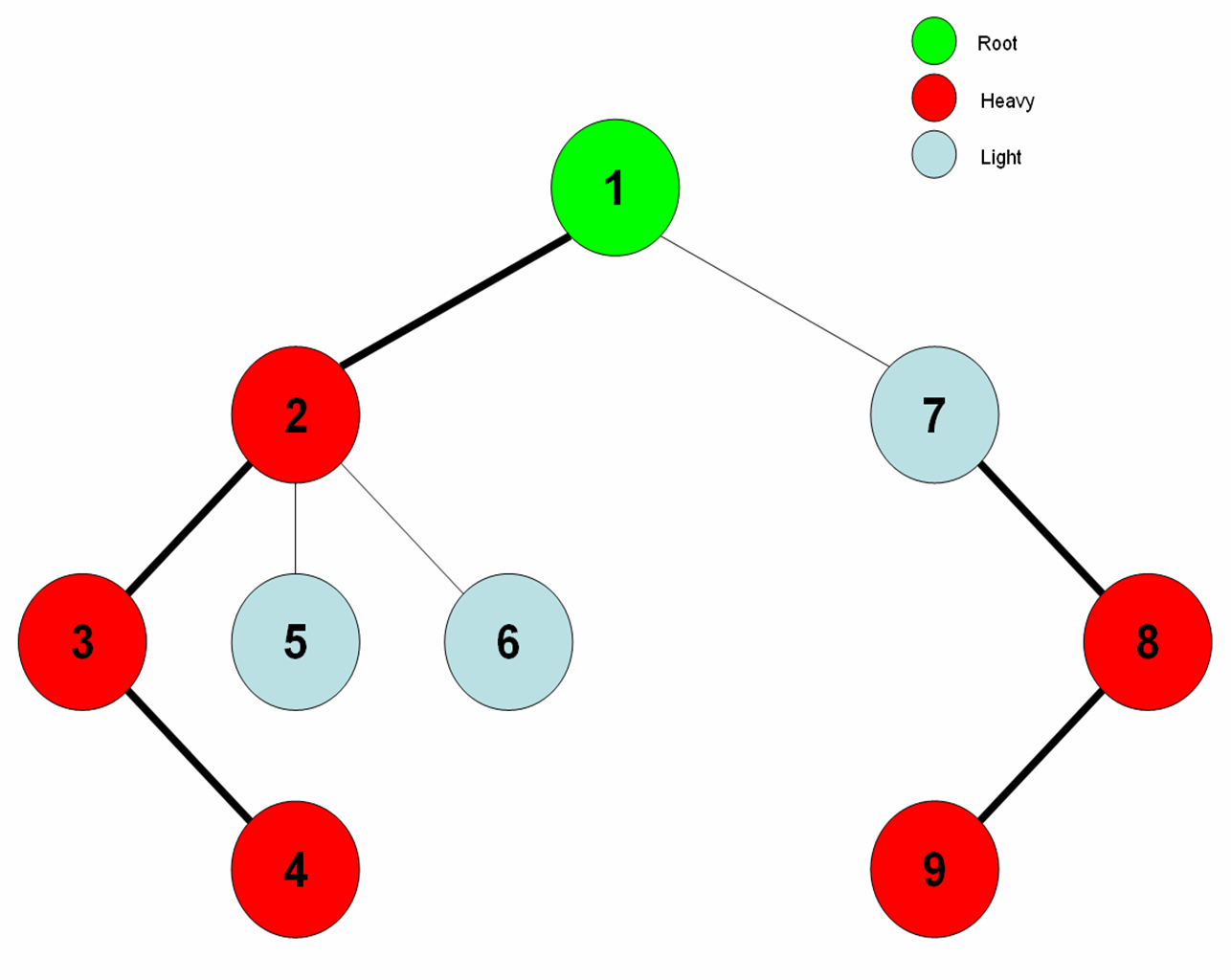为了让树上的链在线性结构上尽量分成较少的链,我们引入树链剖分的关键——轻与重: