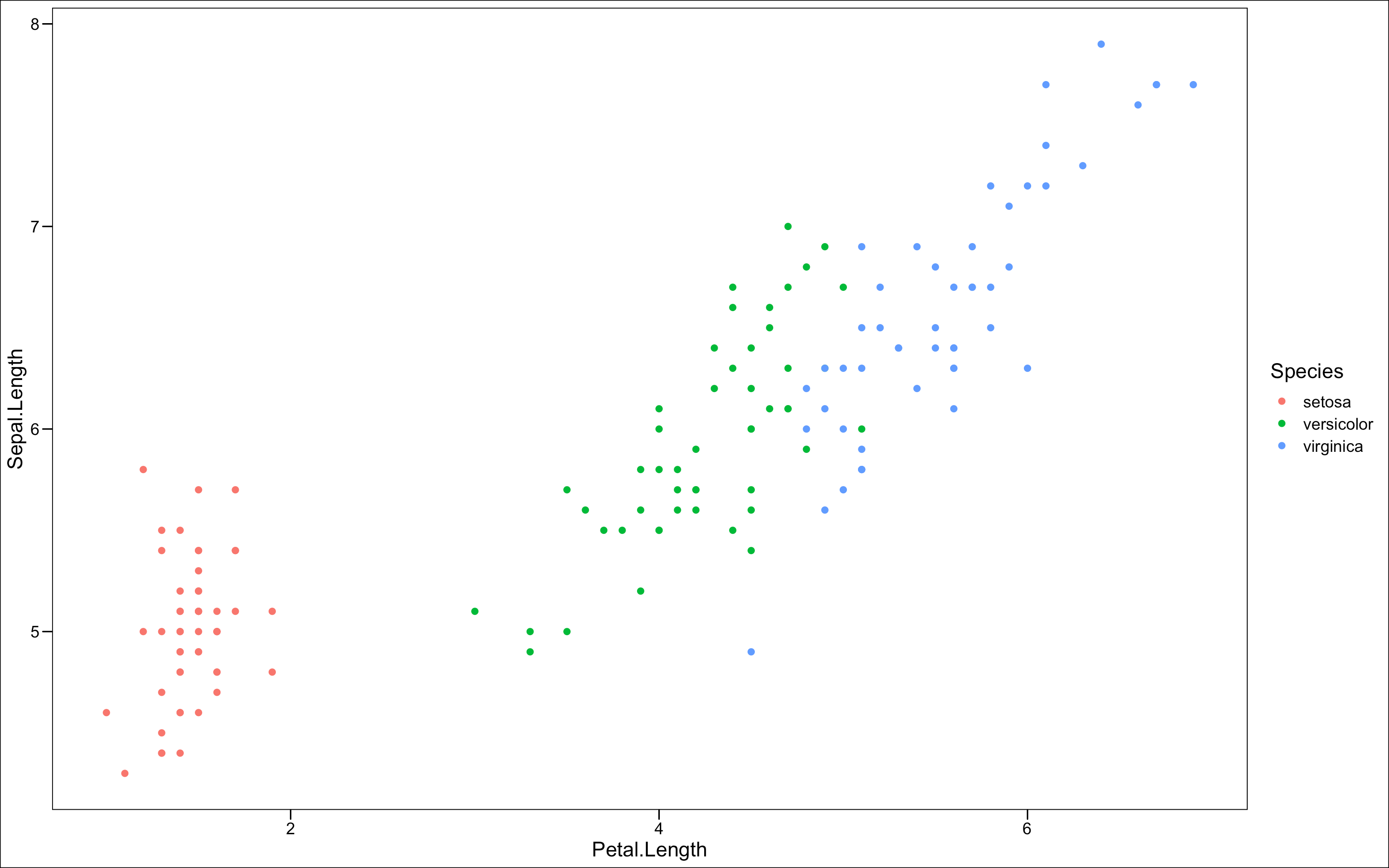 ggscatter(iris, x = "Petal.Length", y = "Sepal.Length", color = "Species") + theme_base()
