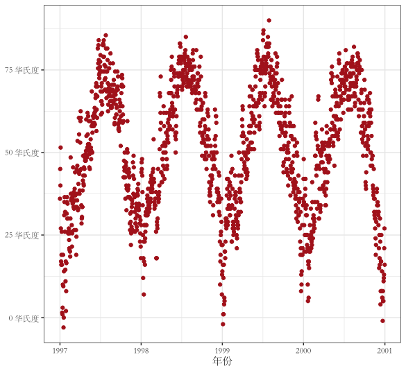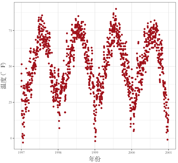 ggplot(chic, aes(x = date, y = temp)) + geom_point(color = "firebrick") + labs(x = "年份", y = "温度 (°F)") + theme( axis.title.x = element_text(vjust = 0, size = 15), axis.title.y = element_text(vjust = 2, size = 15), text = element_text(family = "STSong") )