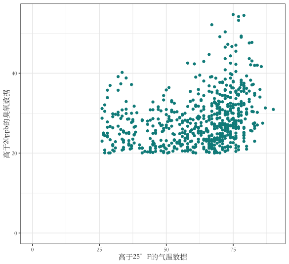 ggplot(chic_high, aes(x = temp, y = o3)) + geom_point(color = "darkcyan") + labs(x = "高于25°F的气温数据", y = "高于20ppb的臭氧数据") + expand_limits(x = 0, y = 0)+ theme(text = element_text(family = "STSong"))
