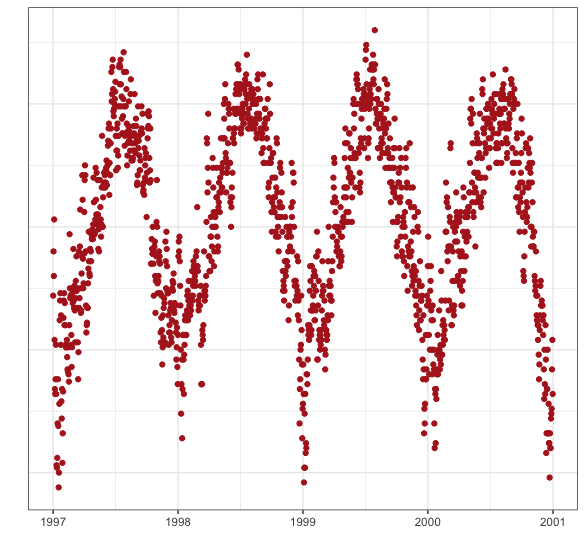 ggplot(chic, aes(x = date, y = temp)) + geom_point(color = "firebrick") + labs(x = NULL, y = "") + theme(axis.ticks.y = element_blank(), axis.text.y = element_blank())