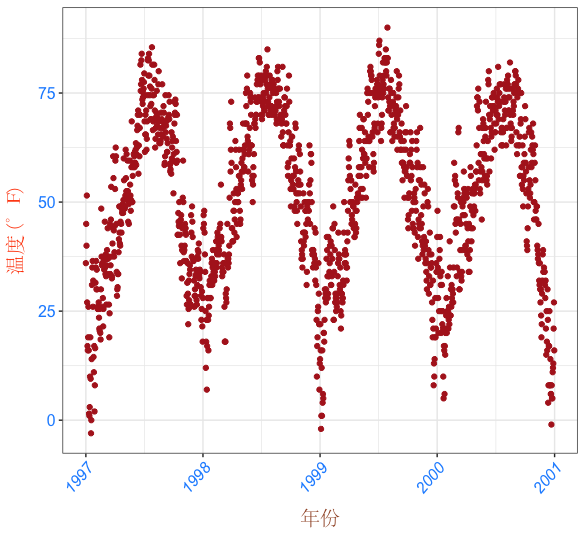 ggplot(chic, aes(x = date, y = temp)) + geom_point(color = "firebrick") + labs(x = "年份", y = "温度 (°F)")+ theme(axis.text = element_text(color = "dodgerblue", size = 12), axis.text.x = element_text(face = "italic",angle = 50, vjust = 1, hjust = 1, size = 12), axis.title = element_text(family = "STSong"), axis.title.x = element_text(margin = margin(t = 10), color = "sienna",size = 15), axis.title.y = element_text(margin = margin(r = 10), color = "orangered",size = 15))