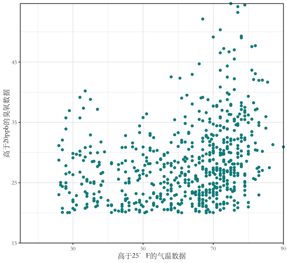 ggplot(chic_high, aes(x = temp, y = o3)) + geom_point(color = "darkcyan") + labs(x = "高于25°F的气温数据", y = "高于20ppb的臭氧数据") + expand_limits(x = 15, y = 15)+ theme(text = element_text(family = "STSong")) + scale_x_continuous(expand = c(0, 0)) + scale_y_continuous(expand = c(0, 0)) + coord_cartesian(clip = "off")