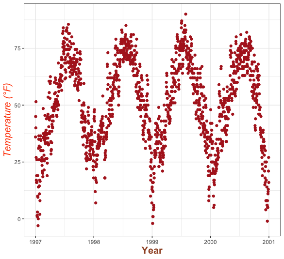 ggplot(chic, aes(x = date, y = temp)) +geom_point(color = "firebrick") + labs(x = "Year", y = "Temperature (°F)") + theme(axis.title = element_text(color = "sienna", size = 15,face = "bold"), axis.title.y = element_text(color = "orangered", size = 15,face = "italic"))