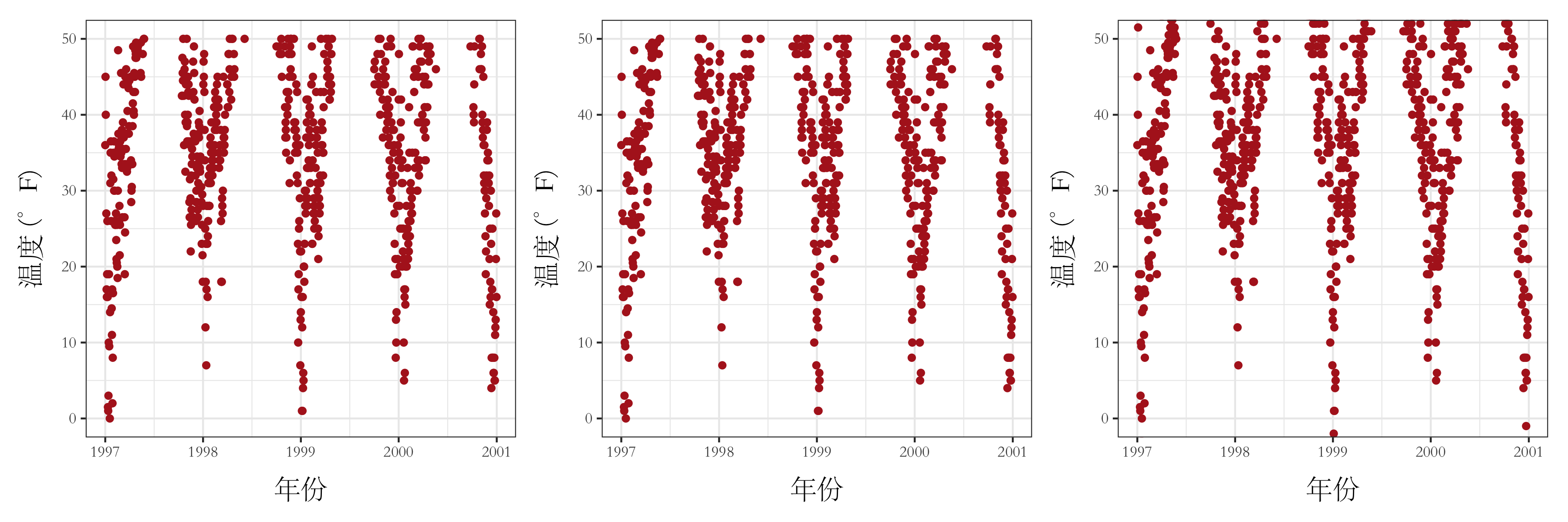 ggplot(chic, aes(x = date, y = temp)) + geom_point(color = "firebrick") + labs(x = "年份", y = "温度 (°F)") + theme( axis.title.x = element_text(margin = margin(t = 10), size = 15), axis.title.y = element_text(margin = margin(r = 10), size = 15), text = element_text(family = "STSong") )