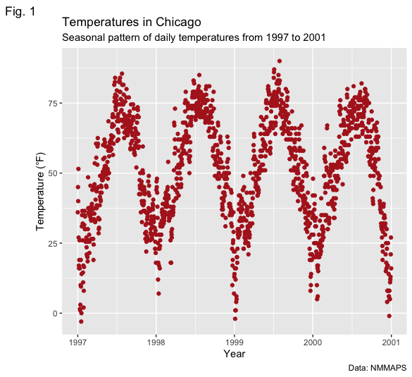 ggplot(chic, aes(x = date, y = temp)) + geom_point(color = "firebrick") + labs(x = "Year", y = "Temperature (°F)", title = "Temperatures in Chicago", subtitle = "Seasonal pattern of daily temperatures from 1997 to 2001", caption = "Data: NMMAPS", tag = "Fig. 1")