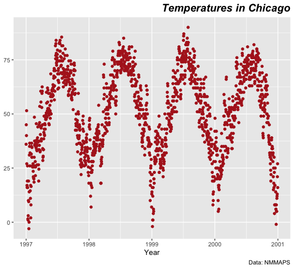 ggplot(chic, aes(x = date, y = temp)) + geom_point(color = "firebrick") + labs(x = "Year", y = NULL, title = "Temperatures in Chicago", caption = "Data: NMMAPS") + theme(plot.title = element_text(hjust = 1, size = 16, face = "bold.italic"))