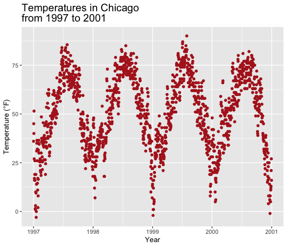 ggplot(chic, aes(x = date, y = temp)) + geom_point(color = "firebrick") + labs(x = "Year", y = "Temperature (°F)", title = "Temperatures in Chicago") + theme(plot.title = element_text(face = "bold", margin = margin(10, 0, 10, 0), size = 14))