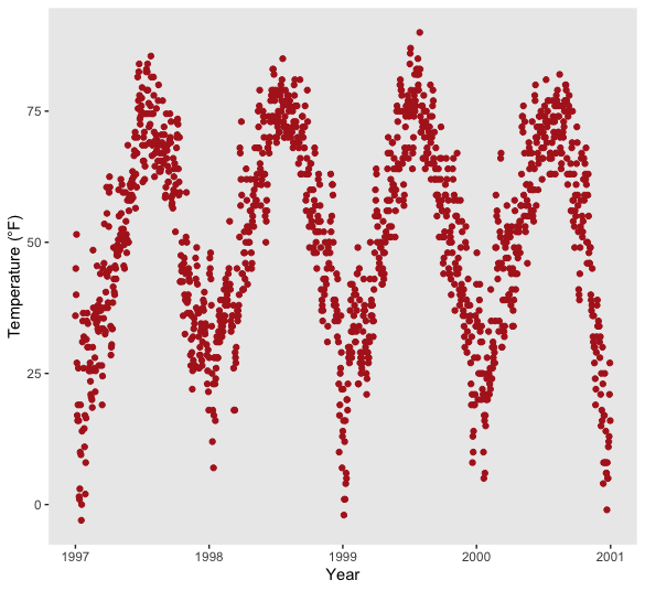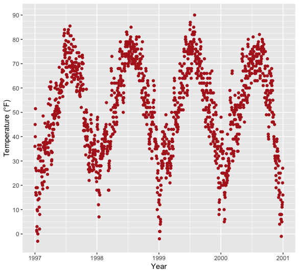 ggplot(chic, aes(x = date, y = temp)) + geom_point(color = "firebrick") + labs(x = "Year", y = "Temperature (°F)") + scale_y_continuous(breaks = seq(0, 100, 10), minor_breaks = seq(0, 100, 2.5))