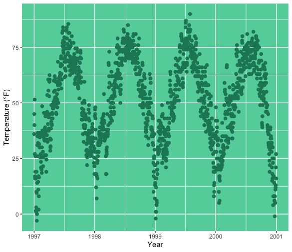 ggplot(chic, aes(x = date, y = temp)) + geom_point(color = "#1D8565", size = 2) + labs(x = "Year", y = "Temperature (°F)") + theme(panel.background = element_rect( fill = "#64D2AA", color = "#64D2AA", size = 2) )