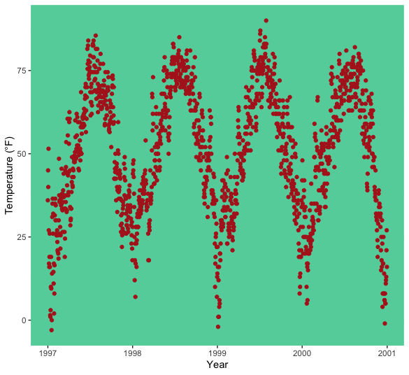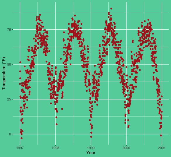 ggplot(chic, aes(x = date, y = temp)) + geom_point(color = "firebrick") + labs(x = "Year", y = "Temperature (°F)") + theme(panel.grid.major = element_line(color = "#64D2AA", size = .5), panel.grid.minor = element_line(color = "#64D2AA", size = .25), panel.background = element_rect(fill = "#64D2AA", color = "#64D2AA", size = 2))