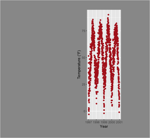 ggplot(chic, aes(x = date, y = temp)) + geom_point(color = "firebrick") + labs(x = "Year", y = "Temperature (°F)") + theme(plot.background = element_rect(fill = "gray60"), plot.margin = margin(t = 1, r = 3, b = 1, l = 8, unit = "cm"))