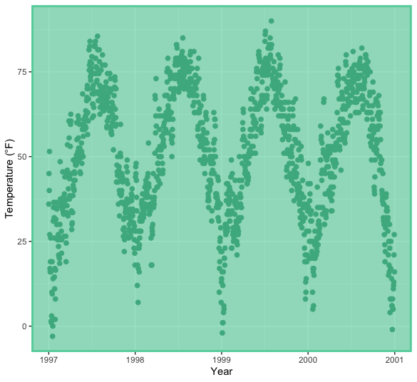 ggplot(chic, aes(x = date, y = temp)) + geom_point(color = "#1D8565", size = 2) + labs(x = "Year", y = "Temperature (°F)") + theme(panel.border = element_rect( fill = "#64D2AA99", color = "#64D2AA", size = 2) )