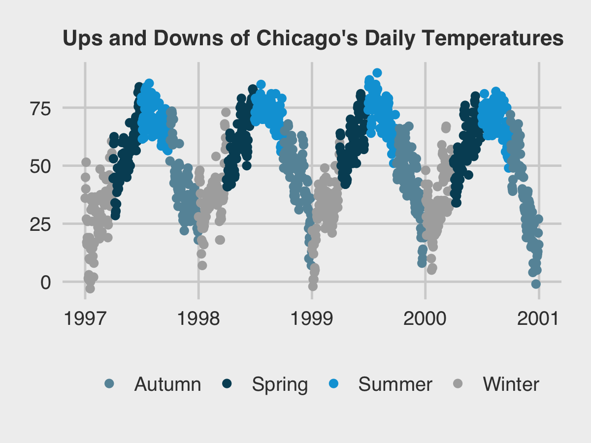 ggplot(chic, aes(x = date, y = temp, color = season)) + geom_point() + labs(x = "Year", y = "Temperature (°F)") + ggtitle("Ups and Downs of Chicago's Daily Temperatures") + theme_fivethirtyeight() + theme(title = element_text(size=7))+ scale_color_economist(name = NULL)
