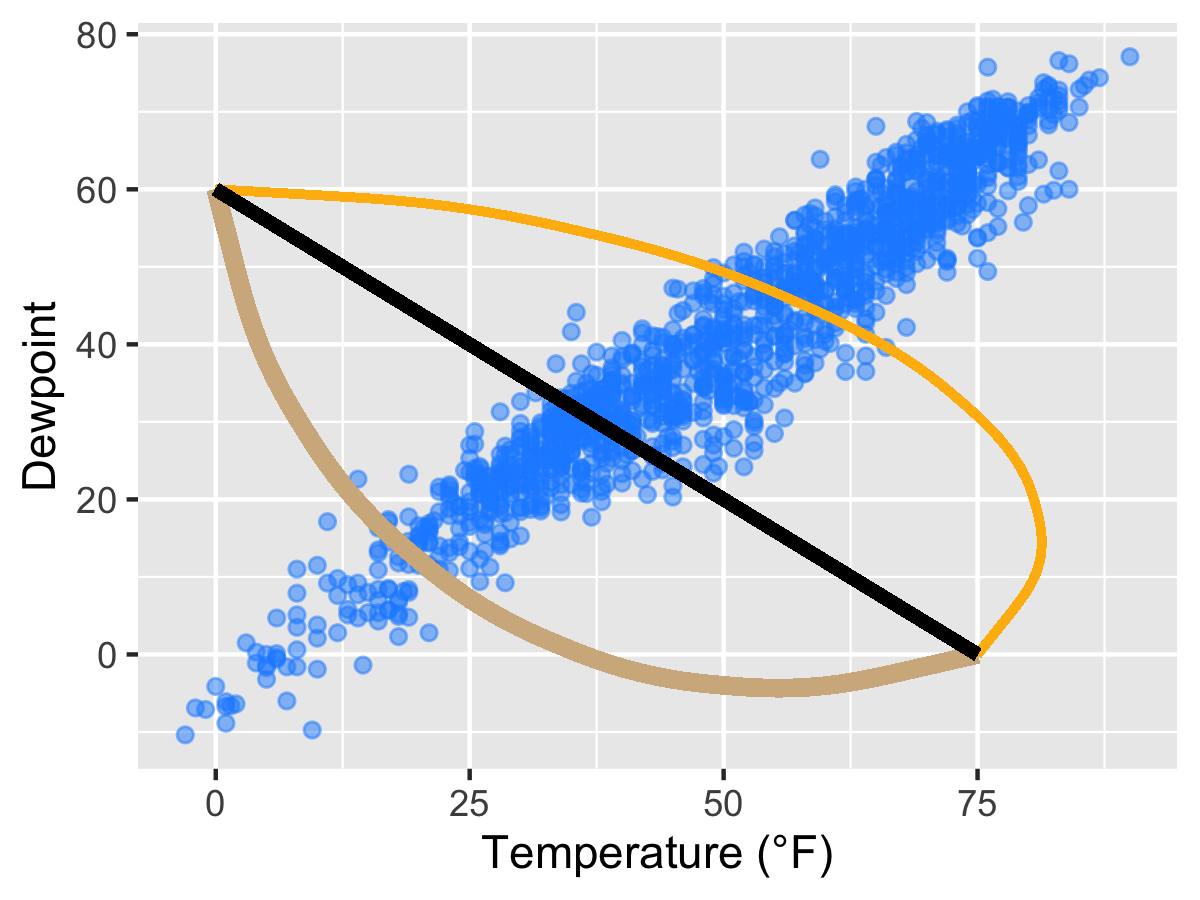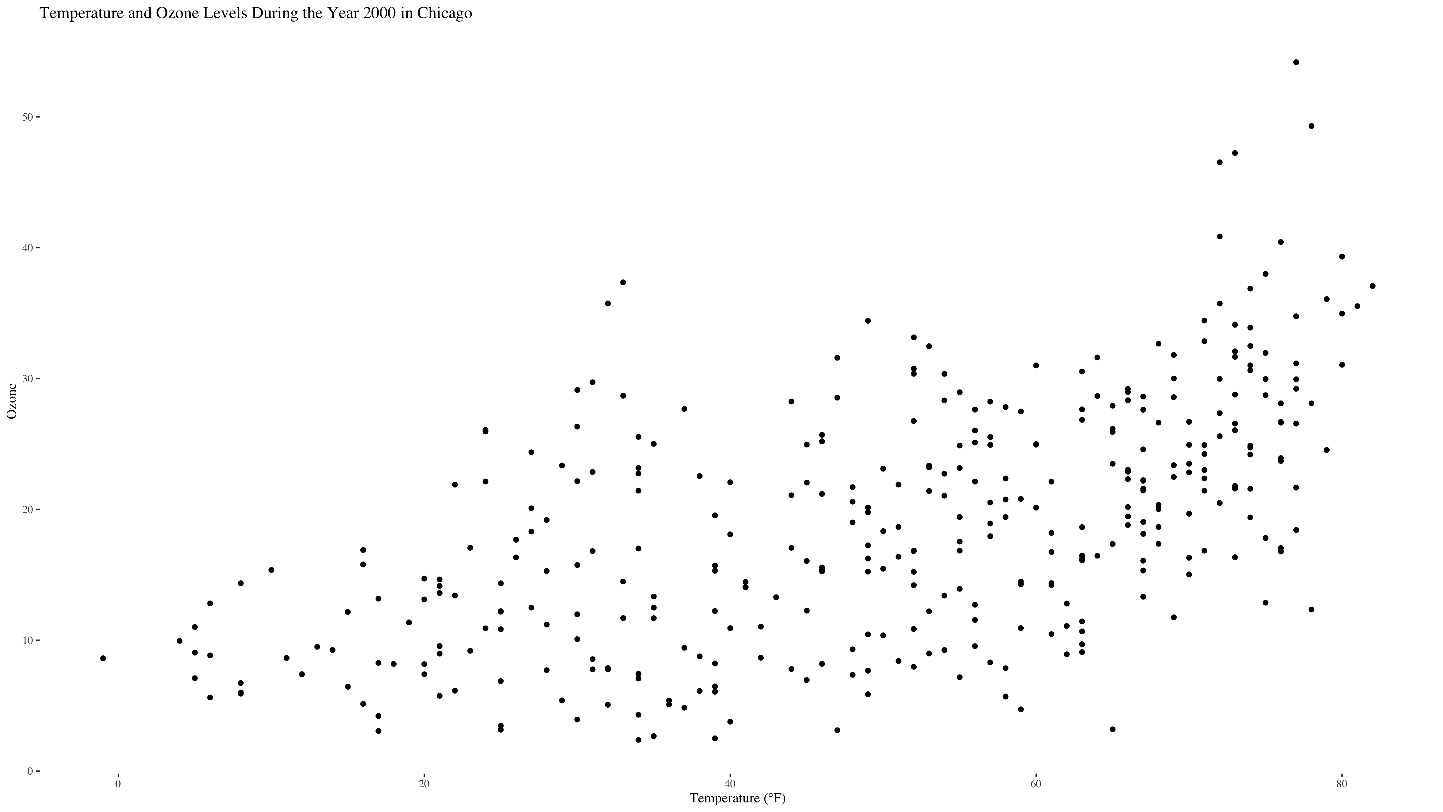 g <- ggplot(chic, aes(x = temp, y = dewpoint)) + geom_point(color = "dodgerblue", alpha = .5) + labs(x = "Temperature (°F)", y = "Dewpoint")