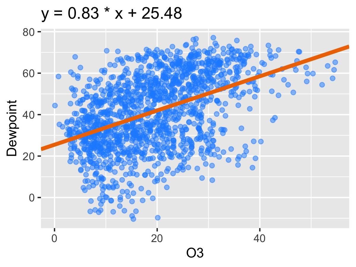 g <- ggplot(chic, aes(x = o3, y = dewpoint)) + geom_point(color = "dodgerblue", alpha = .5) + labs(x = "O3", y = "Dewpoint")