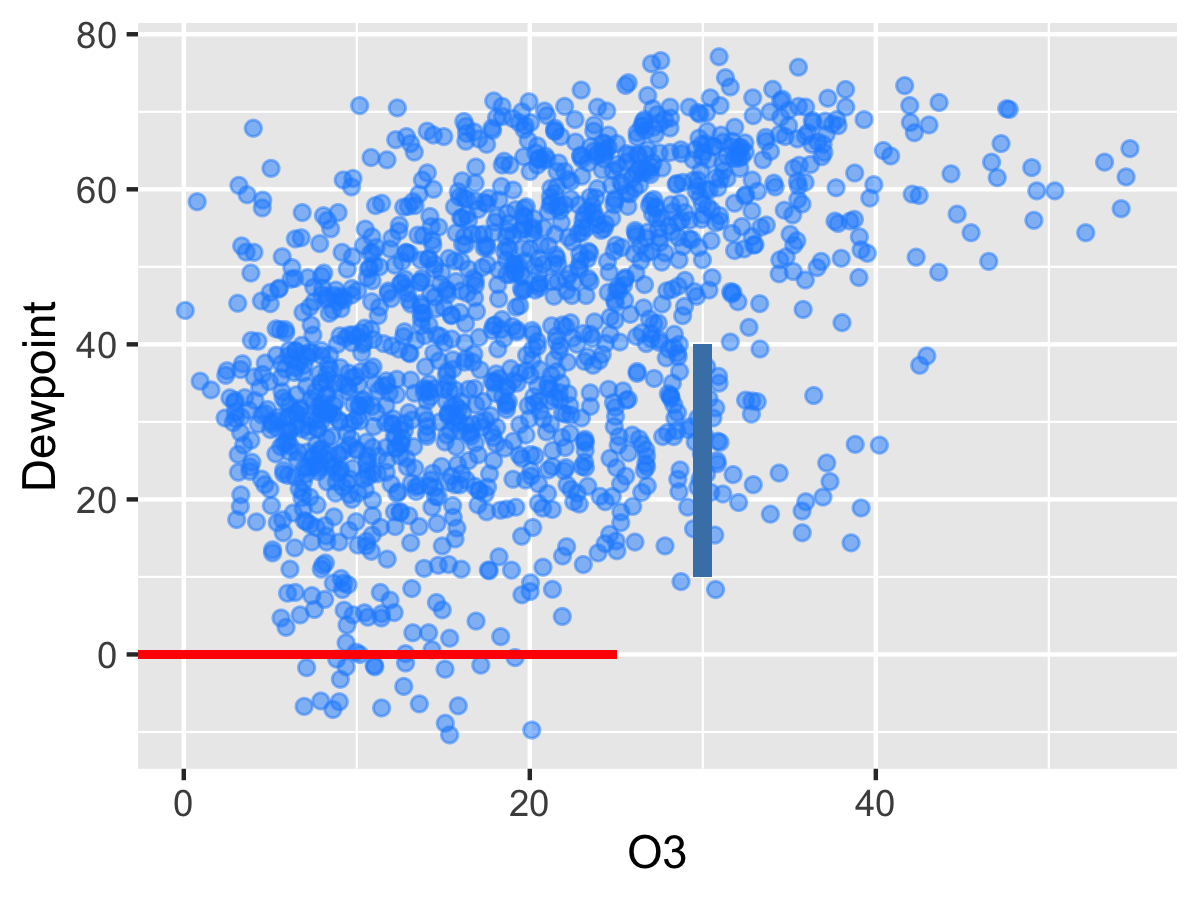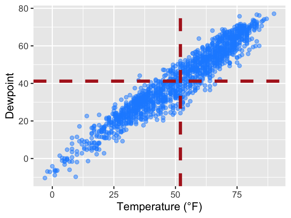 g <- ggplot(chic, aes(x = temp, y = dewpoint)) + geom_point(color = "dodgerblue", alpha = .5) + labs(x = "Temperature (°F)", y = "Dewpoint") g + geom_vline(aes(xintercept = median(temp)), size = 1.5, color = "firebrick", linetype = "dashed") + geom_hline(aes(yintercept = median(dewpoint)), size = 1.5, color = "firebrick", linetype = "dashed")