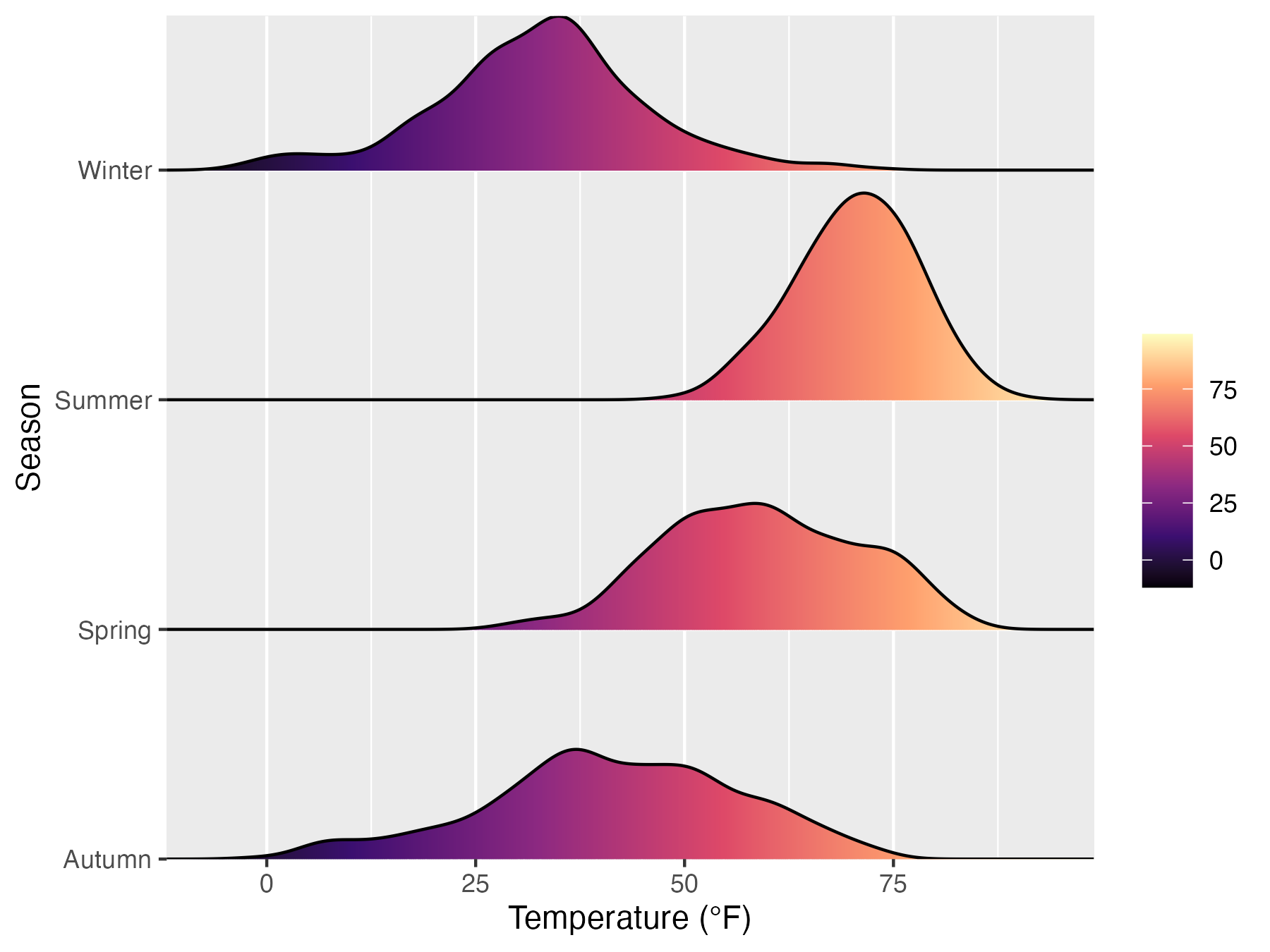 ggplot(chic, aes(x = temp, y = season, fill = ..x..)) + geom_density_ridges_gradient(scale = .9, gradient_lwd = .5, color = "black") + scale_fill_viridis_c(option = "magma", name = "") + coord_cartesian(expand = FALSE) + labs(x = "Temperature (°F)", y = "Season")