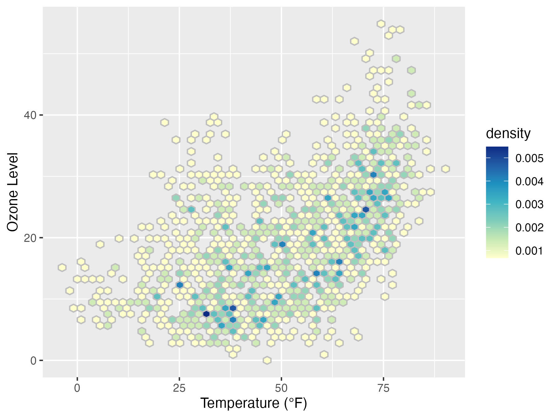 ggplot(chic, aes(temp, o3, fill = ..density..)) + geom_hex(bins = 50, color = "grey") + scale_fill_distiller(palette = "YlGnBu", direction = 1) + labs(x = "Temperature (°F)", y = "Ozone Level")