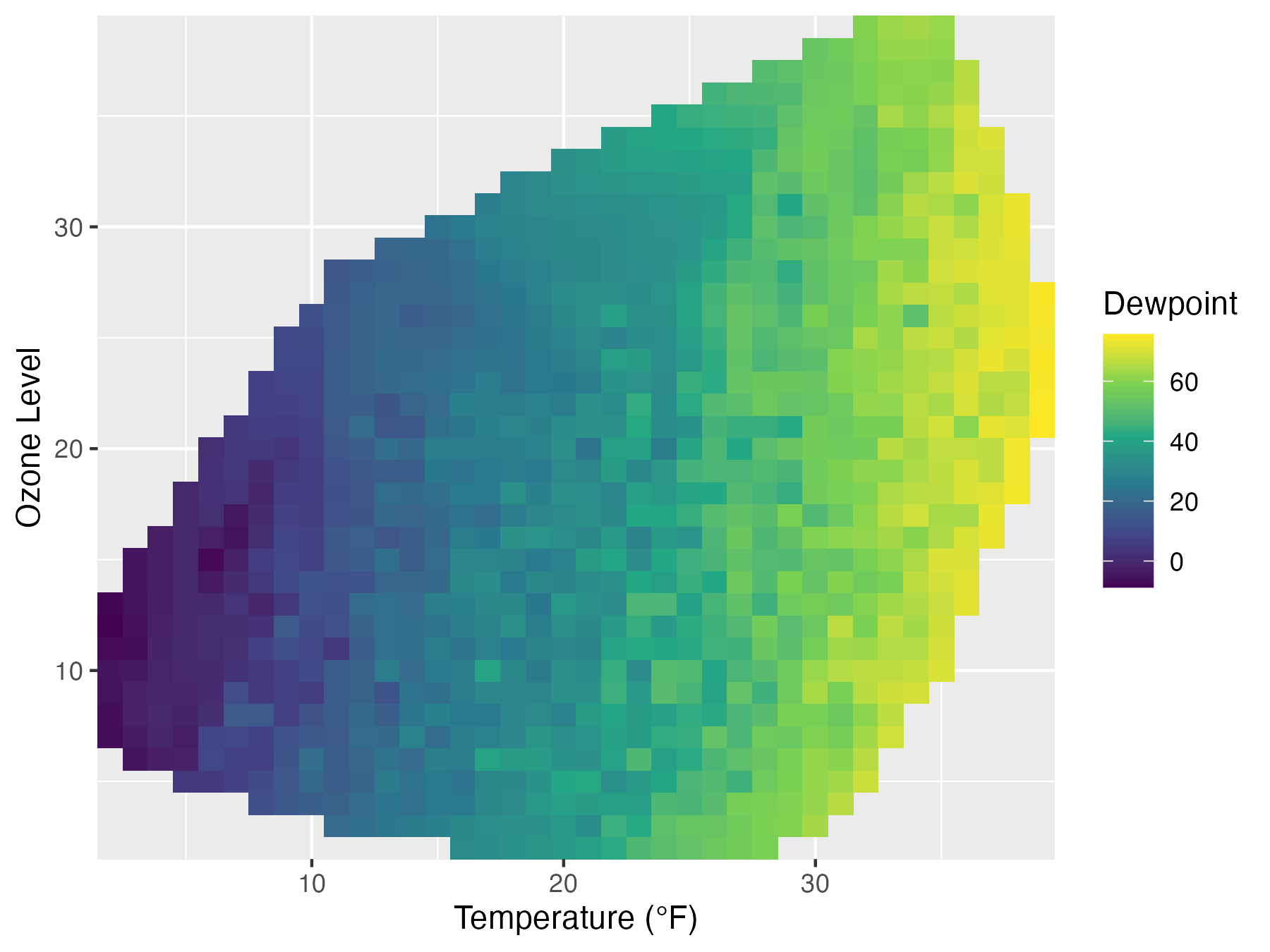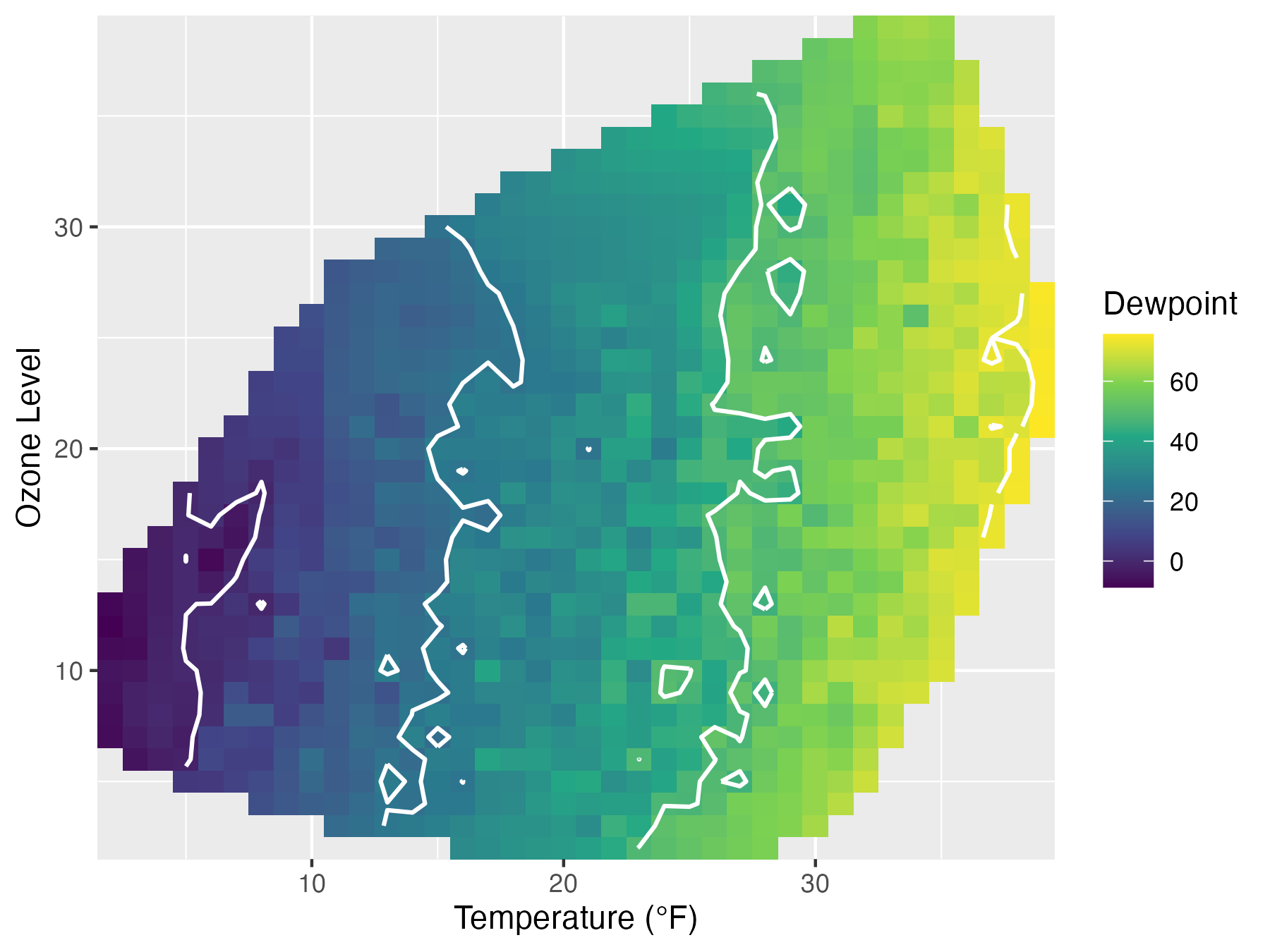 g <- ggplot(data = df, aes(x = x, y = y, z = Dewpoint)) + labs(x = "Temperature (°F)", y = "Ozone Level", color = "Dewpoint")