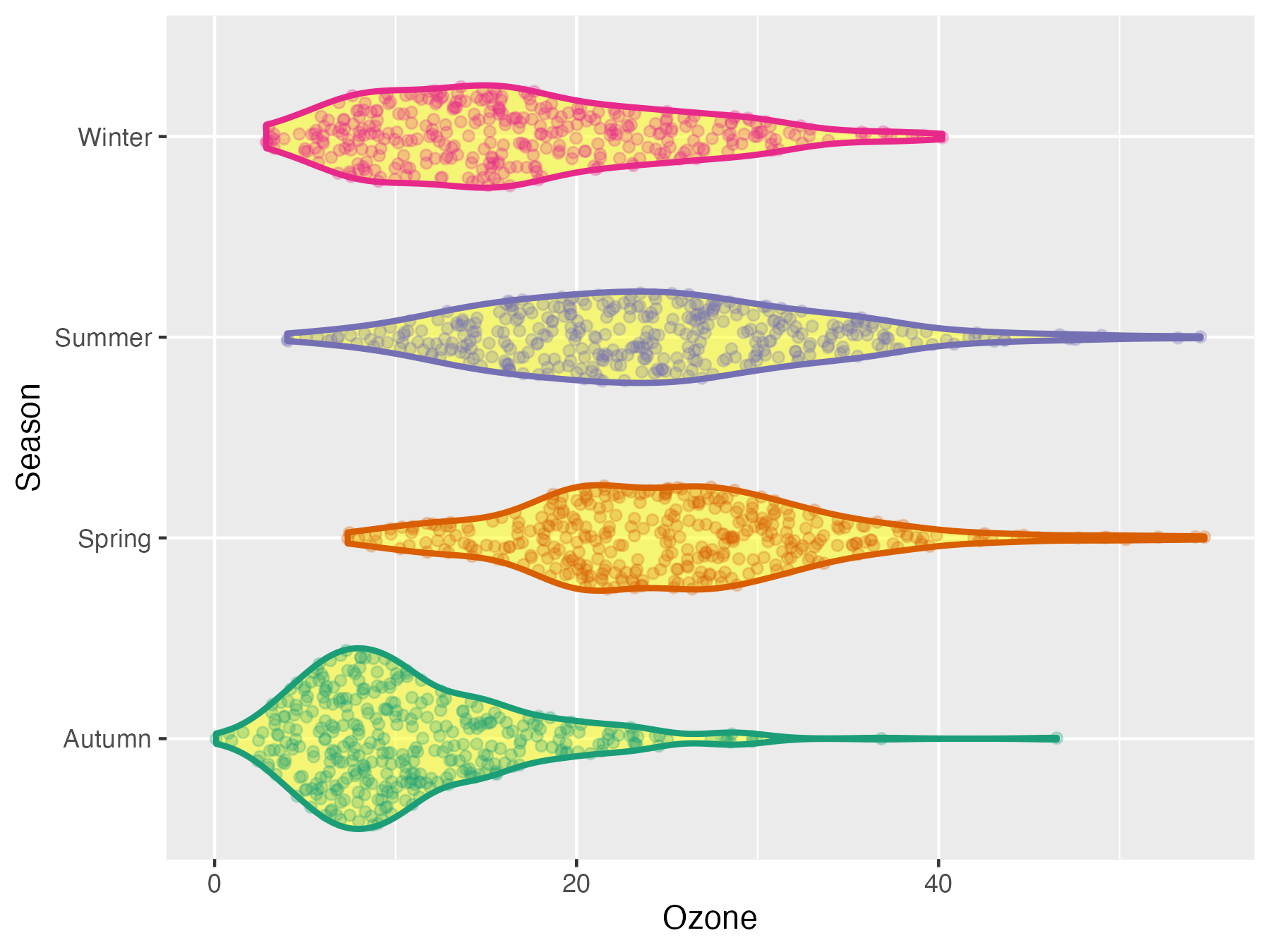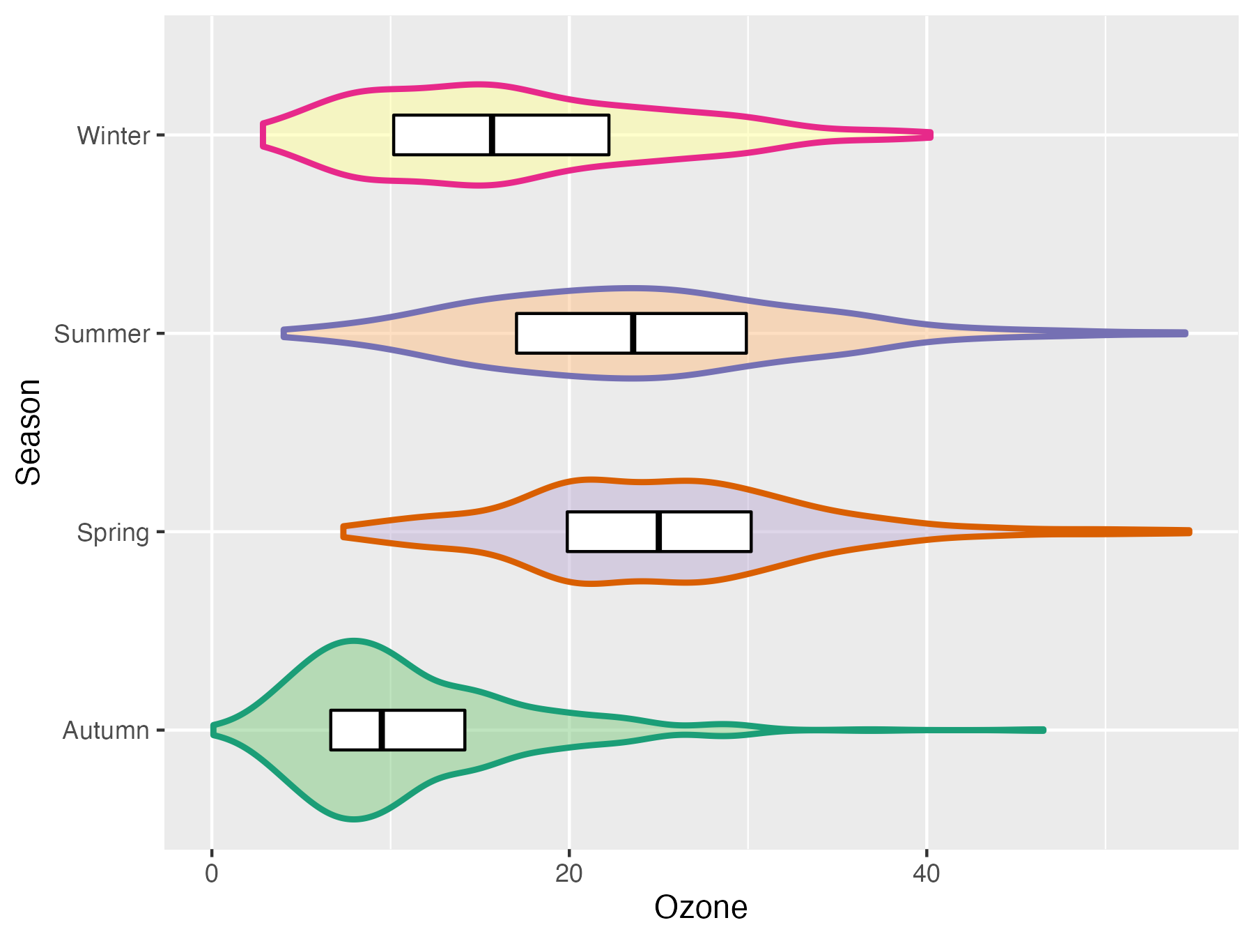 g + geom_violin(aes(fill = season), size = 1, alpha = .5) + geom_boxplot(outlier.alpha = 0, coef = 0, color = "black", width = .2) + scale_fill_brewer(palette = "Accent", guide = "none") + coord_flip()