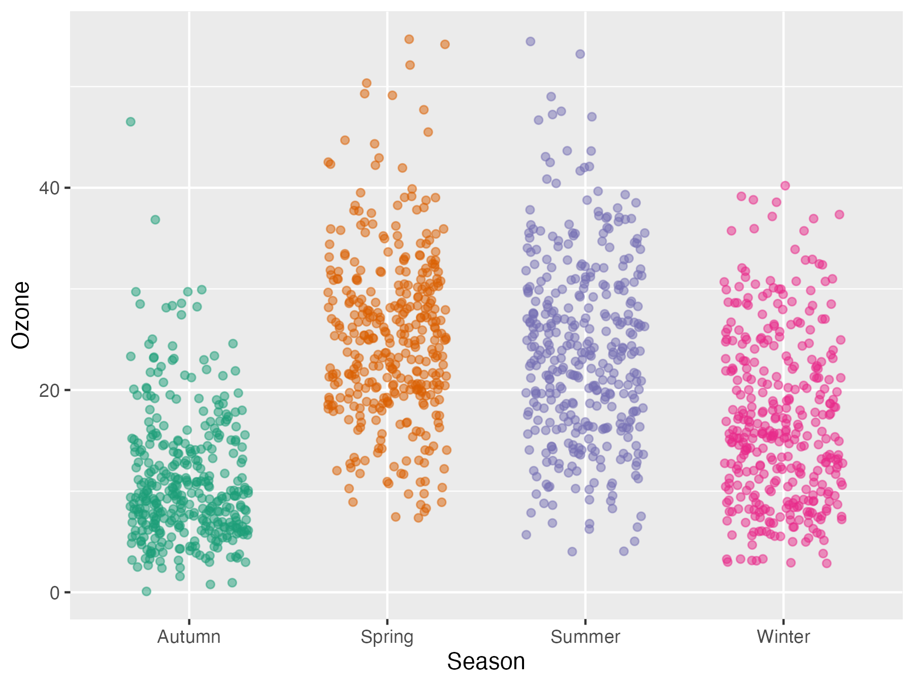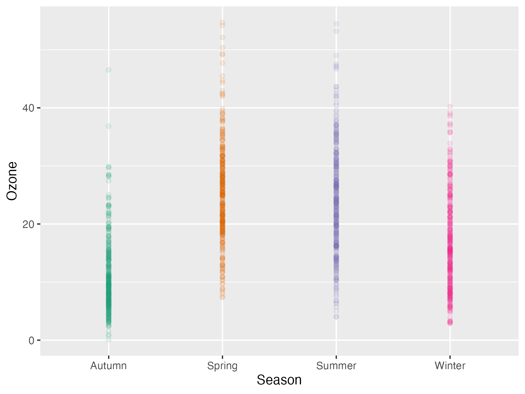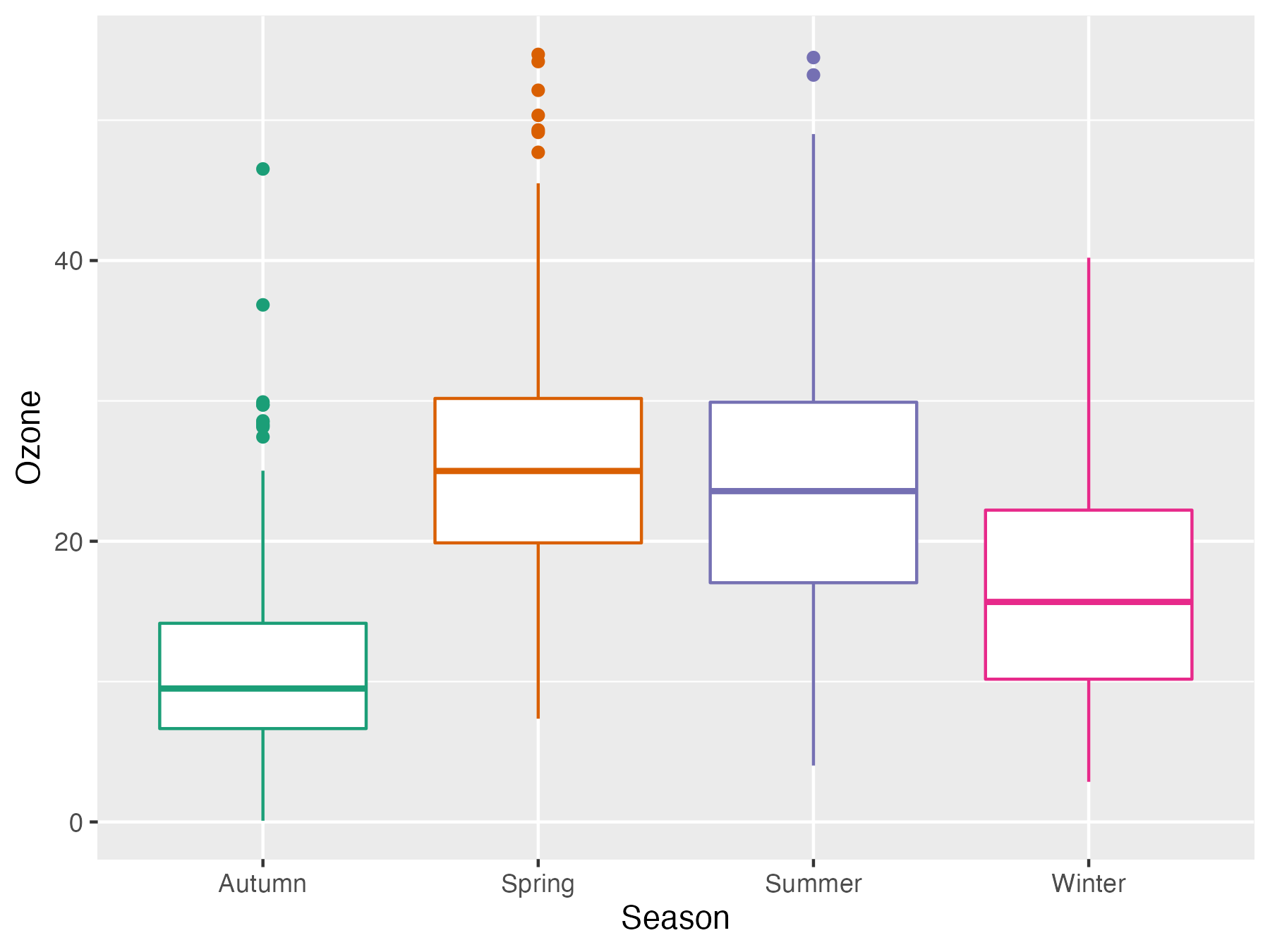g <- ggplot(chic, aes(x = season, y = o3, color = season)) + labs(x = "Season", y = "Ozone") + scale_color_brewer(palette = "Dark2", guide = "none") g + geom_boxplot()