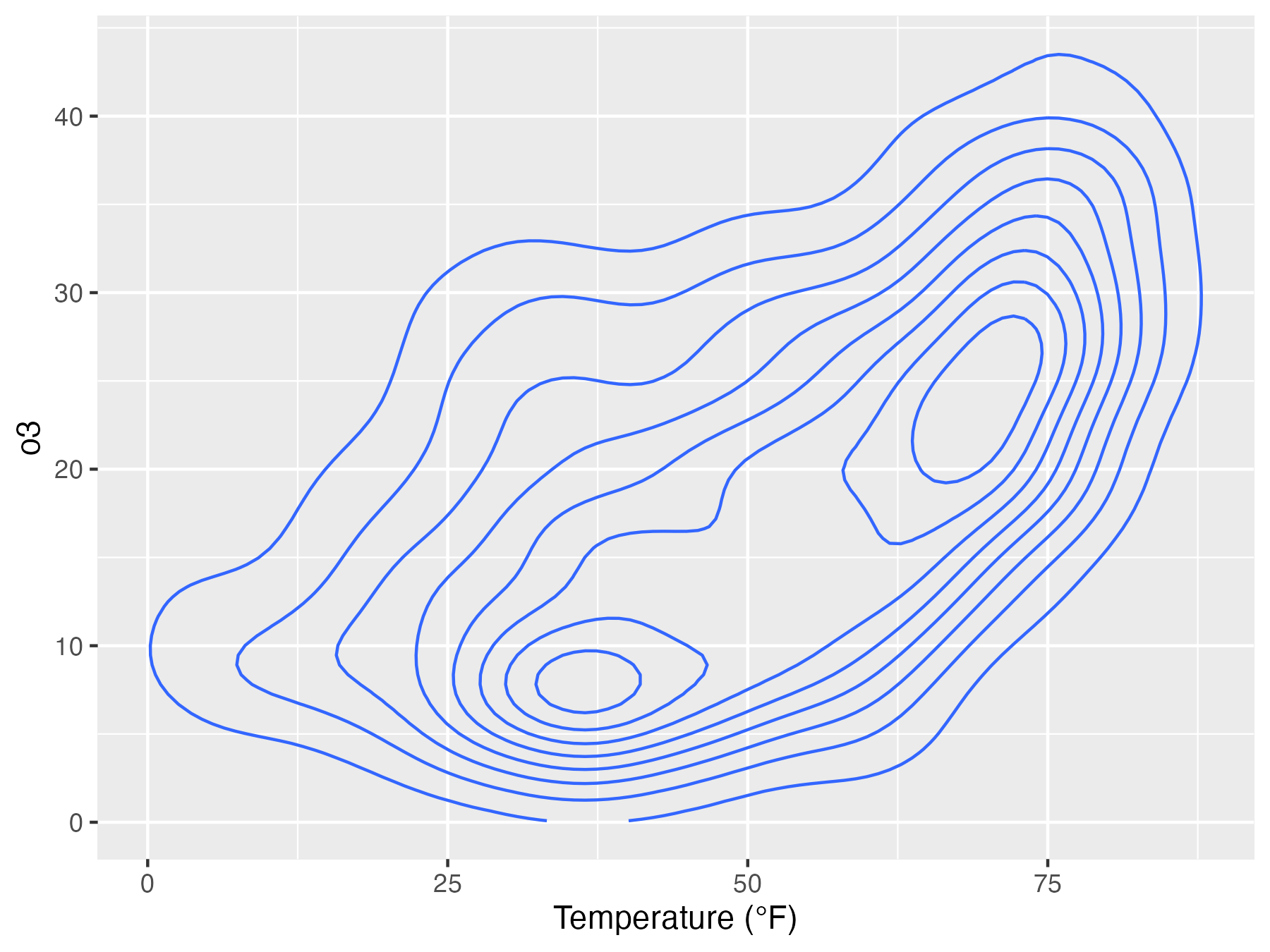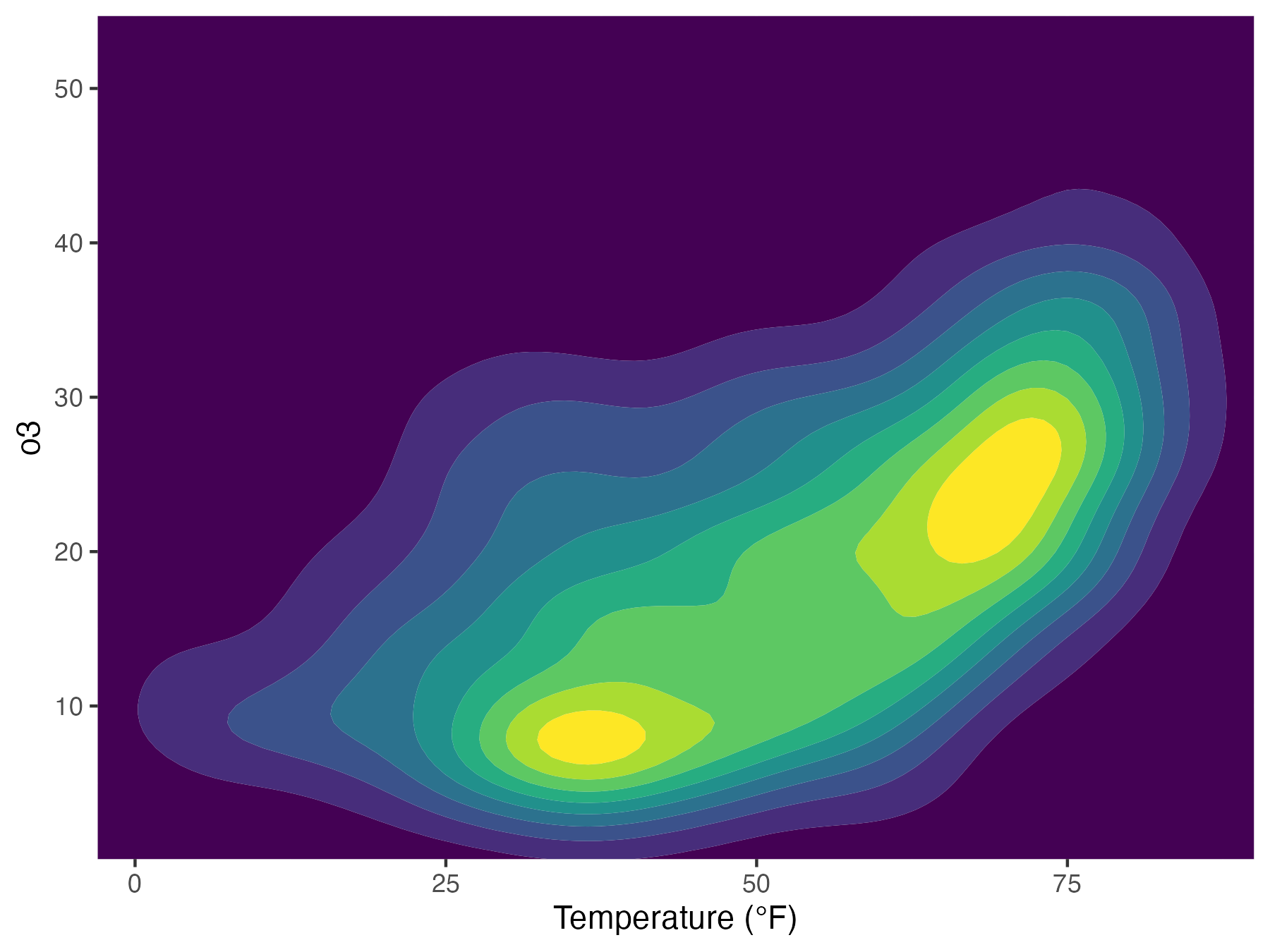ggplot(chic, aes(temp, o3)) + geom_density_2d_filled(show.legend = FALSE) + coord_cartesian(expand = FALSE) + labs(x = "Temperature (°F)", x = "Ozone Level")