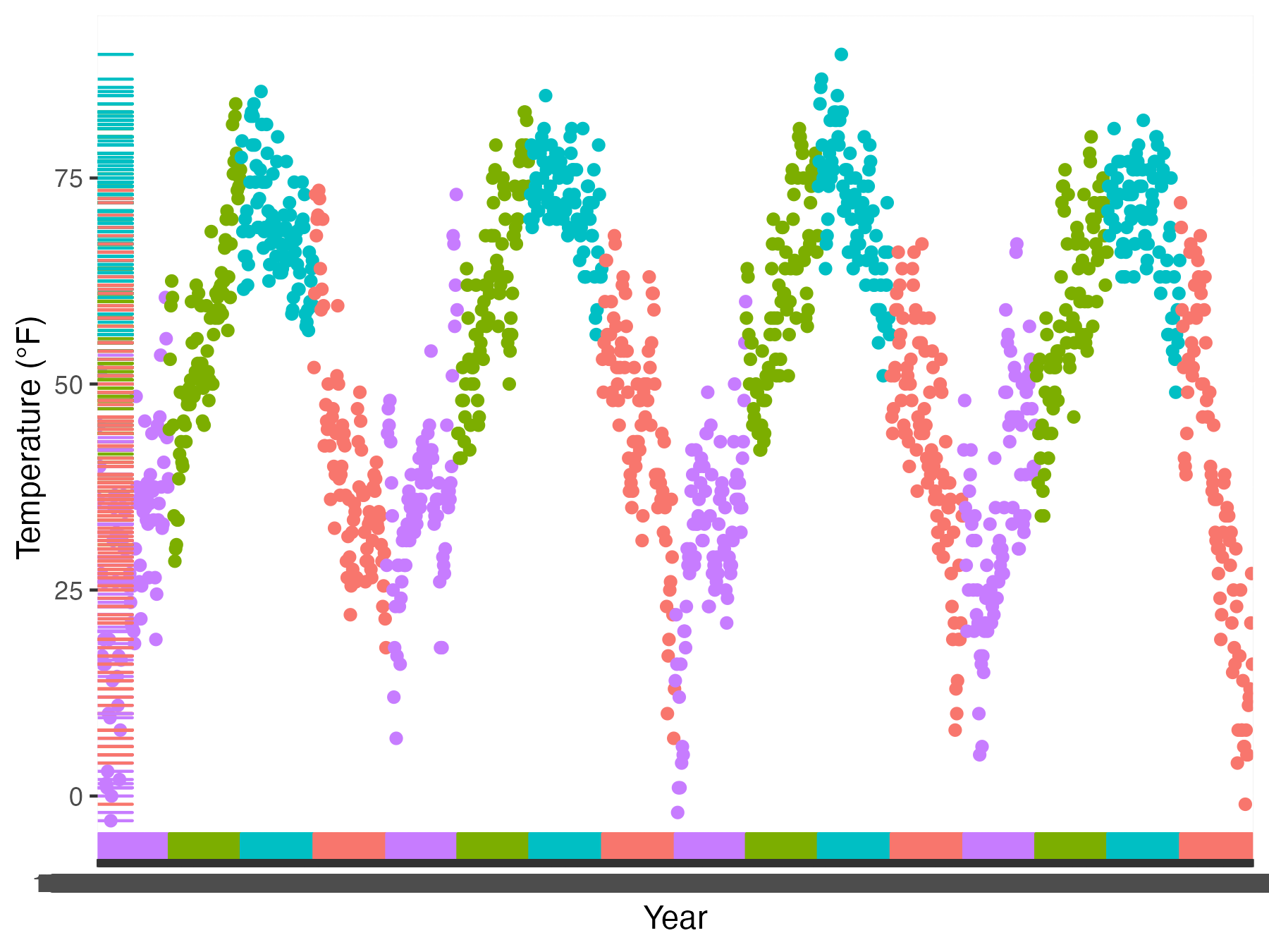 ggplot(chic, aes(x = date, y = temp, color = season)) + geom_point(show.legend = FALSE) + geom_rug(show.legend = FALSE) + labs(x = "Year", y = "Temperature (°F)")
