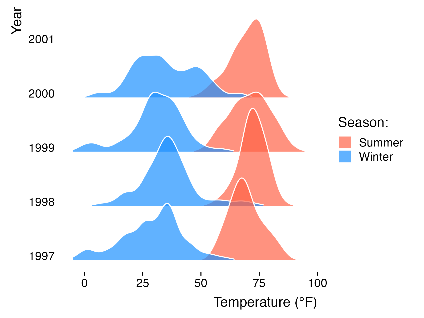 ggplot(data = filter(chic, season %in% c("Summer", "Winter")), aes(x = temp, y = year, fill = paste(year, season))) + geom_density_ridges(alpha = .7, rel_min_height = .01, color = "white", from = -5, to = 95) + scale_fill_cyclical(breaks = c("1998 Summer", "1998 Winter"), labels = c(1998 Summer = "Summer", 1998 Winter = "Winter"), values = c("tomato", "dodgerblue"), name = "Season:", guide = "legend") + theme_ridges(grid = FALSE) + labs(x = "Temperature (°F)", y = "Year")
