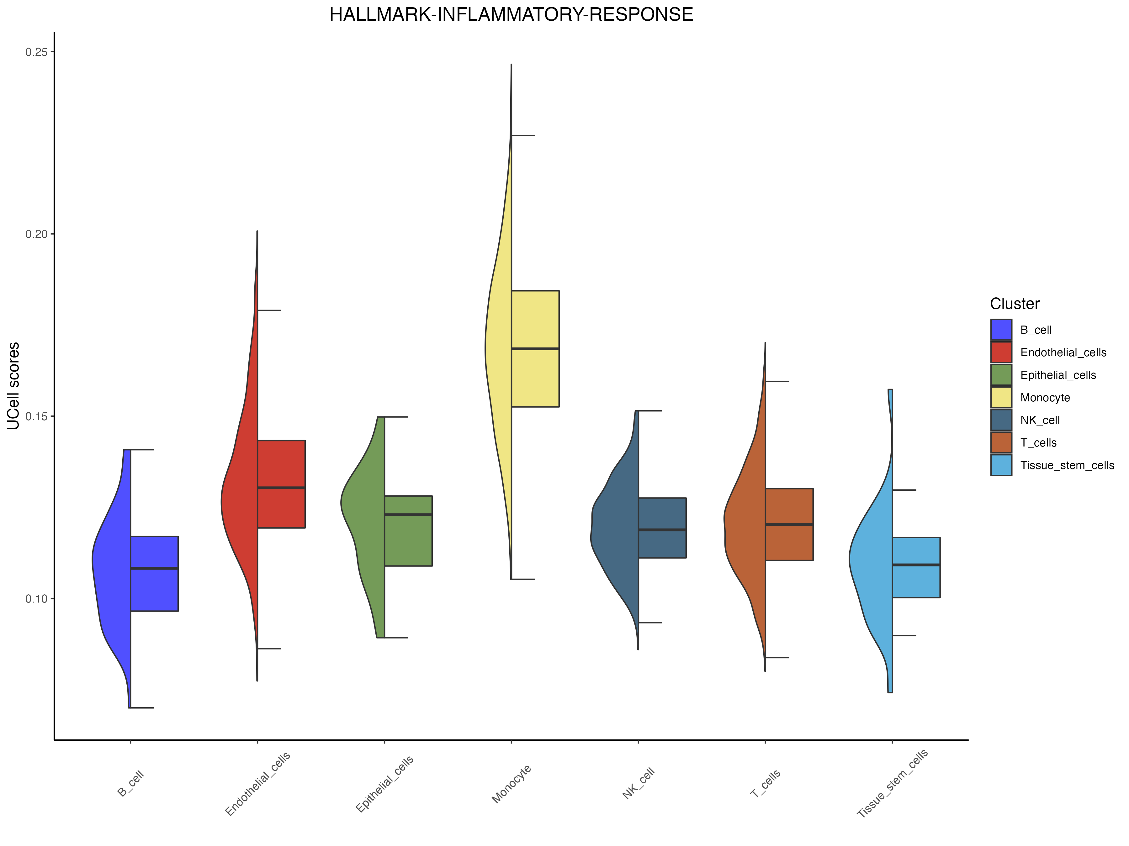 `halfvlnplot <- irGSEA.halfvlnplot(object = scRNA,method = "UCell",show.geneset = "HALLMARK-INFLAMMATORY-RESPONSE")