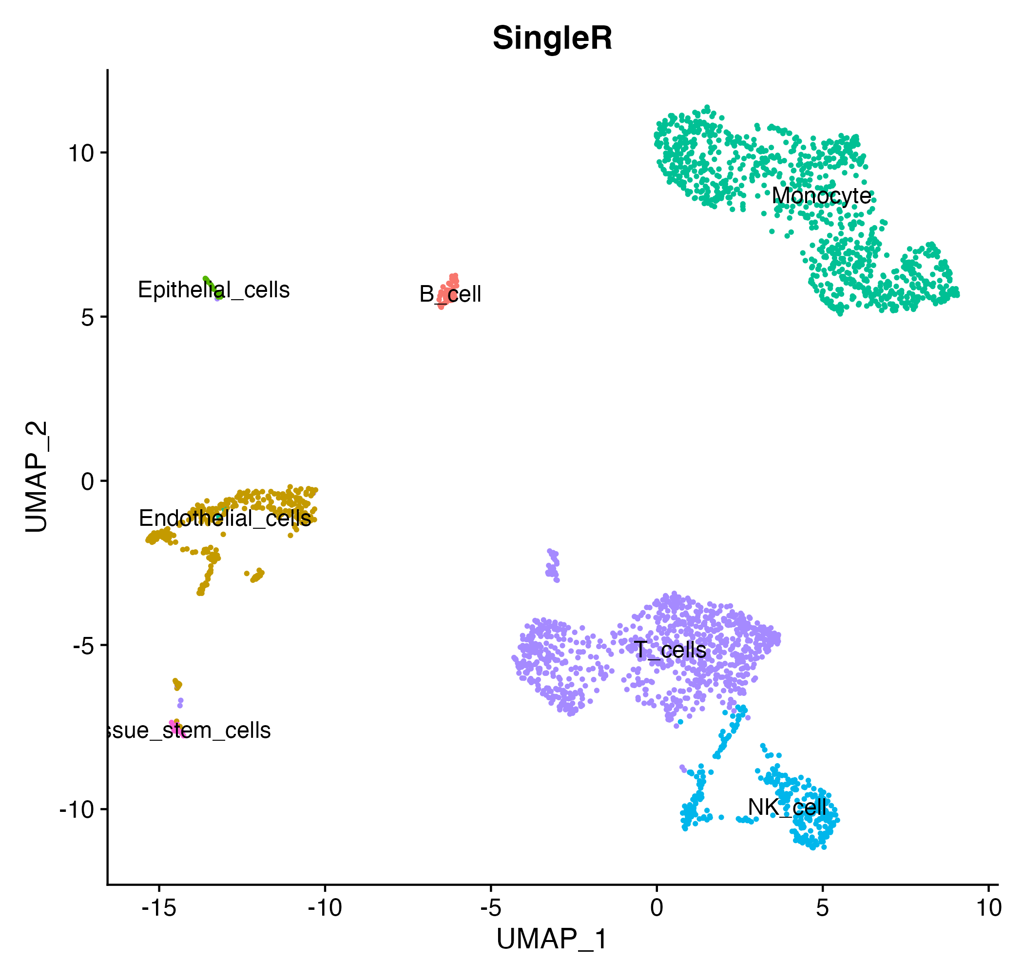 DimPlot(scRNA, reduction = "umap",group.by = "SingleRlabel",label = T) + NoLegend()