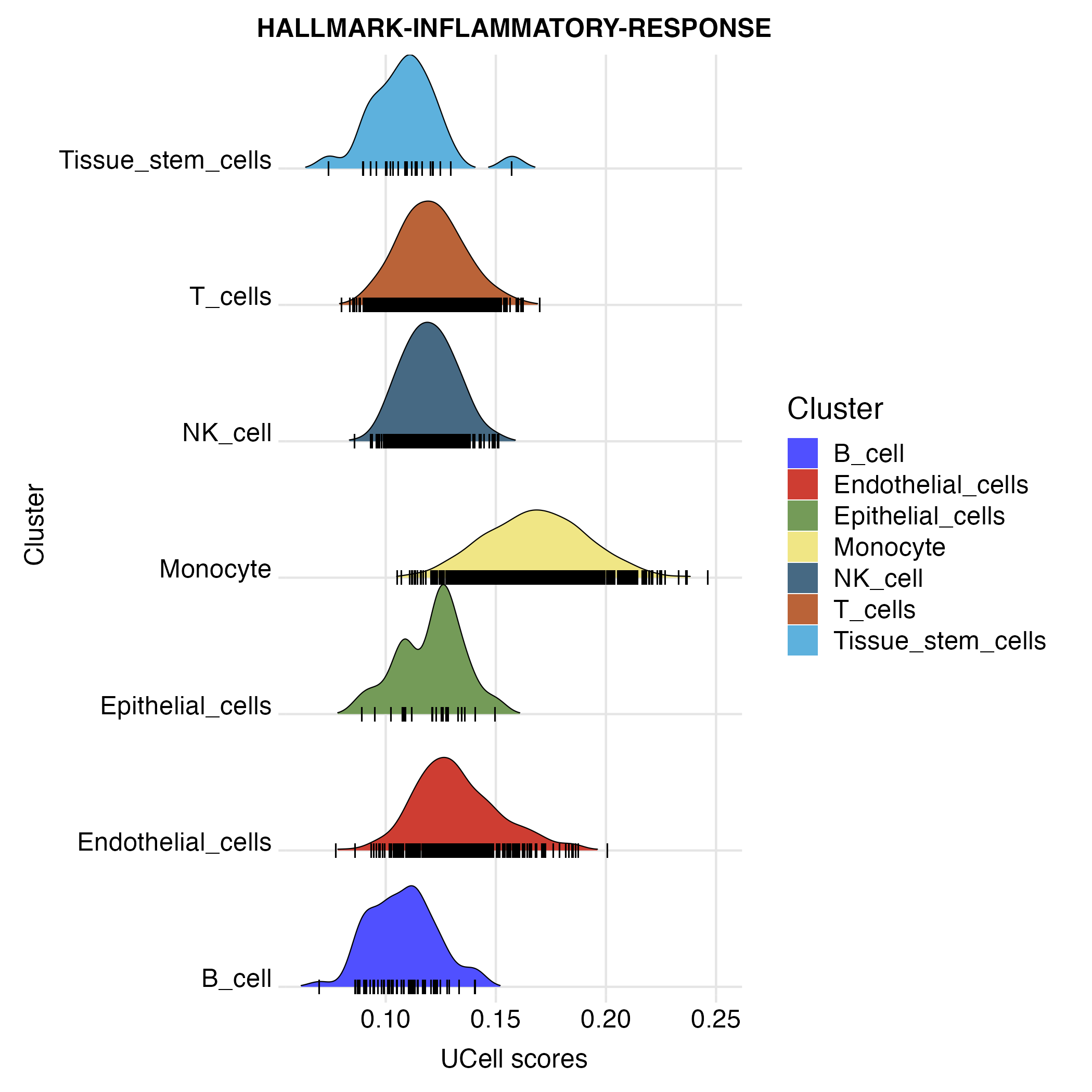 ridgeplot <- irGSEA.ridgeplot(object = scRNA,method = "UCell",show.geneset = "HALLMARK-INFLAMMATORY-RESPONSE")