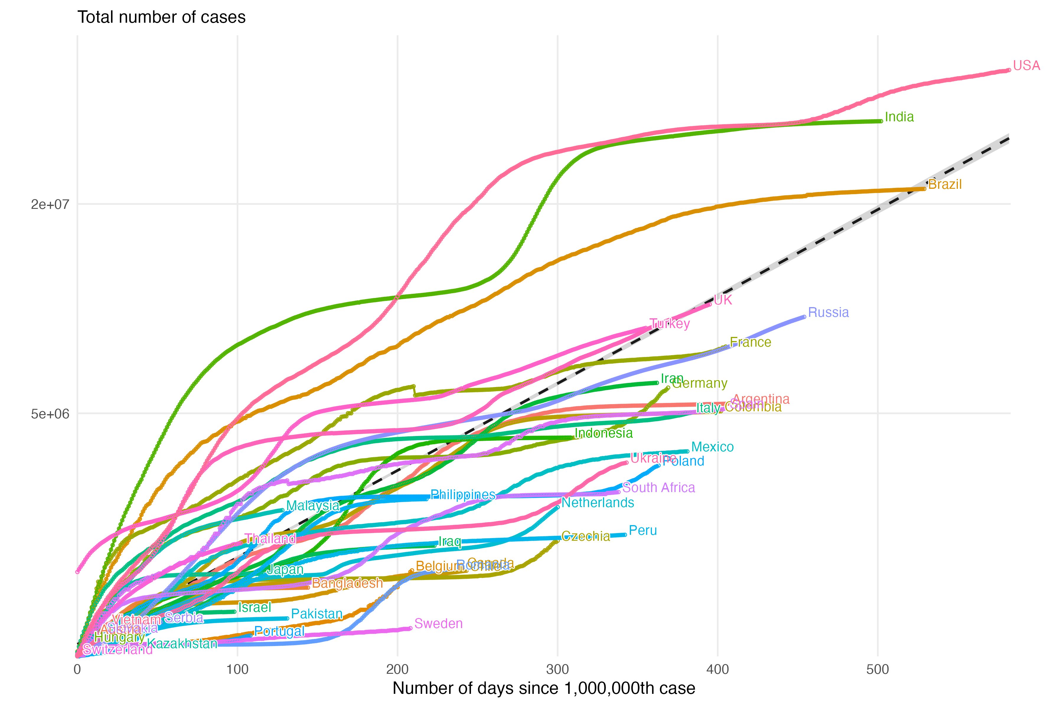 dd <- d %>% as_tibble %>% filter(cases > 1000000) %>% group_by(country) %>% mutate(days_since_1m = as.numeric(date - min(date))) %>% ungroup